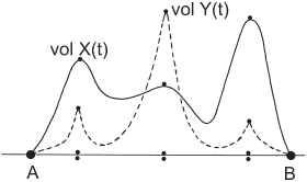 Рис. 39. Графики объемов зависимых летописей X и Y, то есть говорящих примерно об одной и той же эпохе, делают всплески практически одновременно. Однако величины всплесков могут быть существенно различными. (Vol здесь обозначает объем).