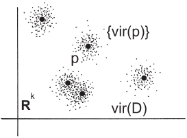 Рис. 42. Каждая династия Р порождает некоторое множество vir (P) виртуальных династий. Геометрически они изображаются в виде «облака», «шарового скопления», окружающего точку P в пространстве соответствующей размерности.