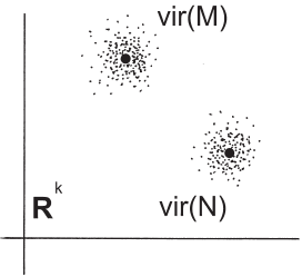 Рис. 43. «Шаровые скопления» vir (M) и vir (N), отвечающие двум заведомо независимым, разным реальным династиям M и N, расположены «далеко друг от друга».