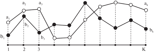 Рис. 44. Наглядное изображение длительностей правлений в двух династиях «a» и «b» в виде графиков.