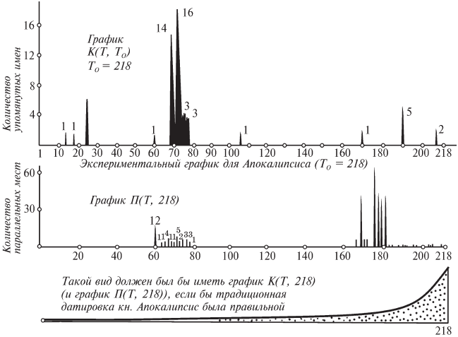 Рис. 47. Частотный график для библейского Апокалипсиса. Отчетливо видно, что максимум графика приходится отнюдь не на «главы», близкие к Апокалипсису, а на удаленные «главы». Это указывает, что принятое сегодня положение Апокалипсиса в библейском каноне, по-видимому, неверно.
