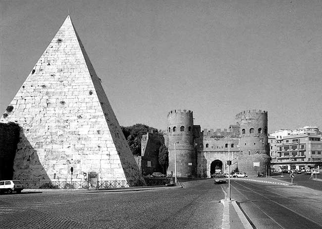 Рис. 168. Пирамида Цестия (Честия) в Риме. Высота пирамиды 27 метров. Считается, что она воздвигнута в XII веке. Сегодня нам говорят, что здесь похоронен претор Кайо Честио Эпулон. Пирамиду считают данью «египетской моде». Взято из [138], с. 41. Петрарка же утверждал, что это могила «античного» Рема.