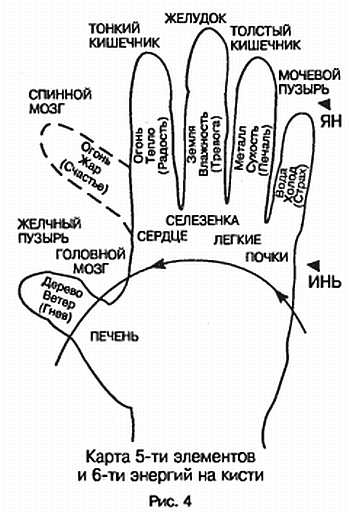 Искомая точка легко фиксируется делением на равные отрезки, обозначенные дужками соответствующего Бель-меридиана. Последовательность расположения точек на инь и ян Бель-меридианах левой кисти можно видеть на рис. 3 в предыдущем номере журнала (№ 5–6, 1995). Точки 6 Ки располагаются также и на Бель-меридианах зачатия и управителя (рис. 2 и 3).