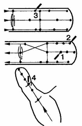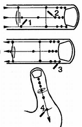 Расчет для определения точного положения точек на фалангах указательного и среднего пальцев руки показан на рис. 1.