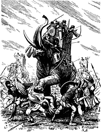 В школе (как сейчас помню — в 5-м классе) нам всем просто и доходчиво объяснили, что в античных армиях довольно широко применялись боевые слоны. Их использовали солдаты индийского царя Пора, воевавшего с Александром Македонским, потом воины Ганнибала, и бойцы царя эпиротов Пирра, прославившегося своей «пирровой победой». На всех схемах античных битв с их участием недрогнувшей рукой кабинетных стратегов изображены отряды слонов; их грозная поступь сотрясает страницы не только школьных учебников, но и серьезных пособий по истории военного искусства, предназначенных для слушателей военных академий. Поколения офицеров охватывала трясучка перед экзаменом по военной истории: не забыть, сколько там было слонов у Ганнибала! Профессор строг, и в вопросе о слонах повышенно щепетилен!
