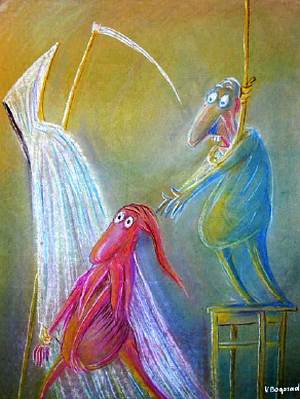 Виктор Богорад — страшный человек. Он повесил, зарезал и утопил массу людей, поссорил множество семей, лишил идеалов неисчислимое количество народа, ехидно расправился со всеми святыми понятиями… И стал явлением в карикатуре "черного" юмора.