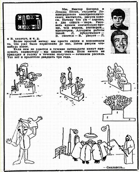 Не сразу, начал с 12 номера, но во втором номере нашелся уголок, где увидел знакомое имя. Впрочем, первая публикация была совместной. Студенты Ленинградского электротехнического института Виктор Богорад и Леонид Песок рисовали вдвоем, Леонид был генератором идей, а Виктор исполнял их на бумаге. Так можно понять их алгоритм работы по комментарию в «Авроре».
