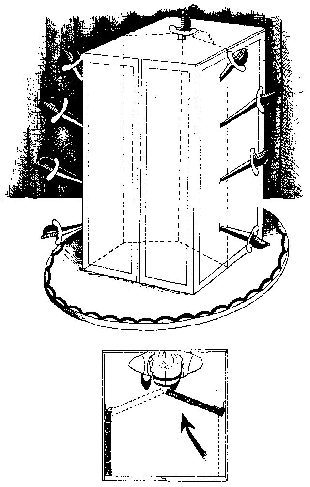 Для меня несложно истыкать стенки саблями перед двумя" зеркалами так, что, когда я открою дверцы, вы увидите мечи и — вы так подумаете — заднюю стенку шкафа. В тот момент, когда я вынимаю сабли, девушка внутри сдвигает зеркала на их прежнее место и они перестают ее загораживать. Она снова появляется!