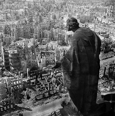 Вид с Дрезденской ратуши на руины города после англо-американских бомбардировок в феврале 1945 года. Справа — скульптура Августа Шрайтмюллера «Добро».