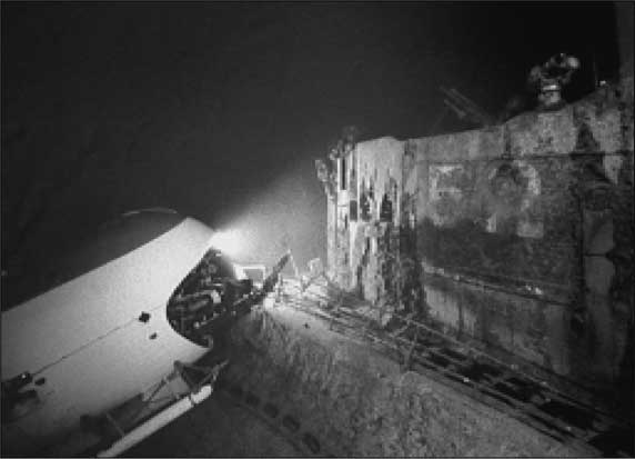 2 мая 1995 года «Келдыш» достиг точки, расположенной в 2400 км от побережья Африки, и с его борта спустили на глубину 5100 м оба «Мира». Через четыре часа от начала погружения Тайдуэлл и его помощники разглядели на дне причудливо громоздившиеся металлические обломки и ящики. Носовую часть субмарины разнесло взрывом, позади рубки зияла огромная пробоина, но открытый входной люк не имел видимых повреждений. Корма уцелела и даже не покрылась донными отложениями.