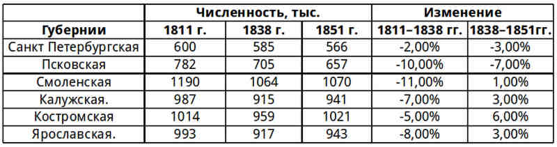 В сокращении численности Смоленской губернии на интервале 1811–1838гг. и в какой–то мере Калужской губернии, должен был сказаться фактор нападения и отступления Наполеона 1812 года. Но фактором Наполеона не объяснить сокращение численности в Санкт–Петербургской, Костромской и Ярославской губерниях.