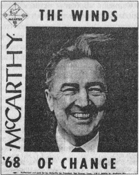 Это обращение Маккарти к поэзии показало, как он понимает своих сторонников: они были изумлены поступком своего кандидата, который крайне редко что-либо предпринимал, дабы понравиться избирателям. По большей части традиционные политики-профессионалы и журналисты, освещавшие в средствах массовой информации его деятельность, не понимали его. Маккарти оставлял без внимания речи и события, нимало о том не беспокоясь. Когда телеведущий Дэвид Фрост спросил у него, что, по его мнению, после его кончины следовало бы написать в некрологе, Маккарти ответил без малейшей иронии: «“Он умер”, я полагаю». Его грандиозная популярность в кампусах колледжей и среди молодежи, не любившей «стандартных» политиков с традиционными взглядами, прежде всего обязана была своим существованием тому, что среди участников предвыборной гонки Маккарти оказался единственным, кто настаивал на немедленном окончании войны во Вьетнаме. В начале его кампании настроенные против войны левые, выдвинувшие его кандидатуру, были настолько разочарованы двусмысленной манерой поведения и полным отсутствием пафоса у сенатора, что начали опасаться неудачи. Некоторые думали, не стоило ли обратиться к Бобби Кеннеди. Однако стиль Маккарти импонировал молодежи, которой не нравились лидеры и, напротив, были симпатичны те, кто вел себя не как лидер. Молодежь говорила о нем так, будто он был поэтом, впоследствии ставшим сенатором, хотя истинное положение вещей (не столь романтическое), заключавшееся в том, что он смог «превратиться» в поэта, явилось, пожалуй, более удачным трюком.