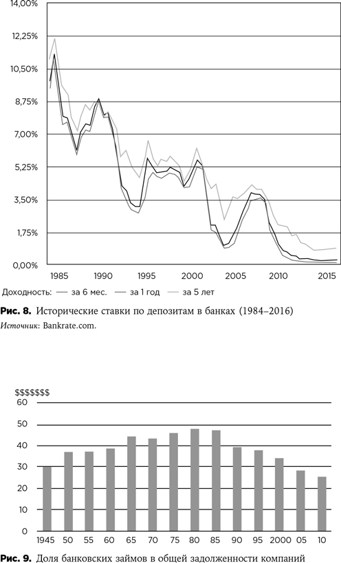 Вряд ли теперь нас удивит и тот факт, что с 1985 года неуклонно снижалась доля банковских кредитов в общем долговом финансировании экономик — с 48 % в 1985 году до 24 % в 2010 году — банкам стало просто неоткуда брать деньги, вкладчики пошли на рынки капитала прямиком.