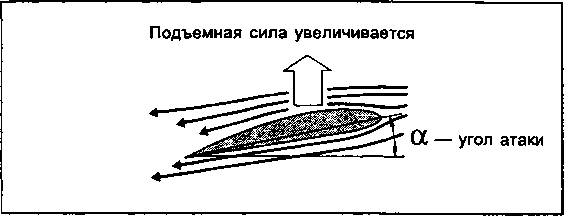 Здесь необходимо сделать небольшой экскурс в область аэродинамики. Дело в том, что подъемная сила создается крылом за счет двух основных факторов: несимметричности профиля крыла и установки его под некоторым углом к набегающему воздушному потоку. Этот угол называется углом атаки крыла и обозначается греческой буквой а.