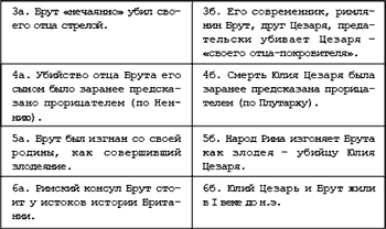 Как все мы хорошо знаем, предательское убийство Цезаря — один из самых ярких эпизодов в биографии античного римлянина Брута. Но фактически об этом же эпизоде говорят и старые английские хроники. Они утверждают, что Брут — первый король бриттов — убил своего отца. Причем, как считается, «случайно», не желая этого (якобы стрелой, попавшей по ошибке в «отца Брута»). По-видимому, перед нами слегка искаженный рассказ об убийстве Брутом своего бывшего друга и покровителя Юлия Цезаря. В обоих рассказах — римском и английском — народ изгоняет Брута с родины, и он пускается в странствия.