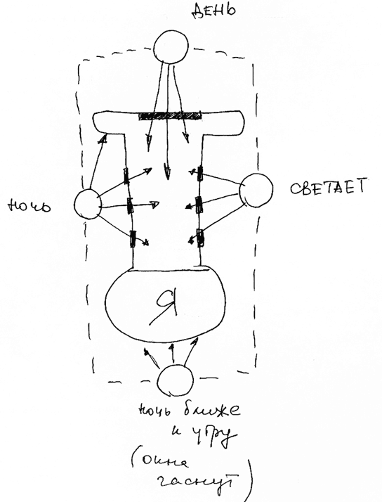 День третий: Сегодня второе основание пересек яркий огненный шар и скрылся за краем цилиндра. Основание при этом имело необычный голубой цвет. Гениальное прозрение: кристаллические включения — это окна в стенах цилиндра! Когда огненный шар (я назвал его «солнце») скрывается за стенами цилиндра, лучи его проникают через эти окна, вызывая их свечение. Ближе к следующему дню окна гаснут, чтобы под утро частично зажечься снова. Обдумал, почему это так, и составил первую схему Вселенной, которая многое объясняет (рис. 1).