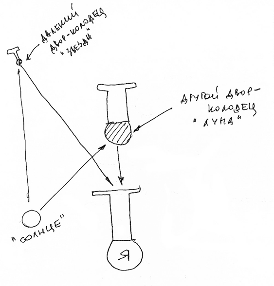 День пятый: Сегодня ночью испугался до полусмерти: в неурочное время второе основание пересек светящийся шар. Думал, что настал конец света, однако выяснилось: это совсем не тот шар. Он — серебристый и светит не так ярко. Гениальная догадка: это другой двор-колодец! Я вижу его внешнюю сторону, освещенную лучами моего «солнца». Теперь я знаю, как я сам выгляжу со стороны (рис. 2)! И теперь мне ясно, что это за светящиеся точки, которые я видел и раньше, но считал инородными включениями внутри прозрачного второго основания: это еще более удаленные дворы-колодцы, отражающие лучи моего «солнца»! Ввожу ряд новых терминов: ближайший ДК — «луна», удаленные ДК — «звезды», прозрачное основание — «небо».