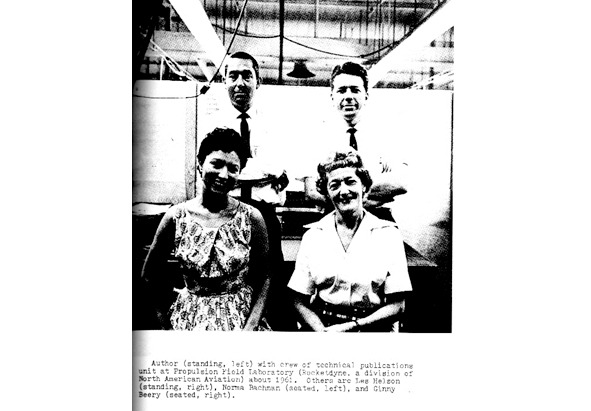 Фотография сотрудников «Рокетдайн»: Автор (стоит слева) с папками технической документации, блок в лаборатории двигательной сферы.