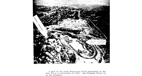 В скалистой части — Полевая Лаборатория Двигателей на «Simi Hills», в Калифорнии в 1959 году. Долина Сан-Фернандо находится дальше, на большом расстоянии.