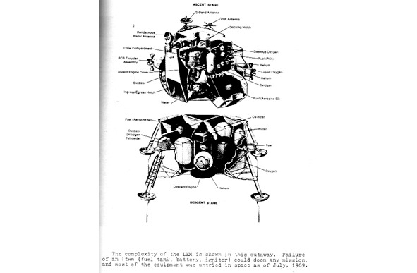 Сложное устройство ЛМ показано в разрезе. Отказ одного элемента (топливный бак, аккумулятор, воспламенитель) может обречь любую миссию на гибель, большая часть оборудования была брошена, якобы, в пространстве и на «луне» в период, с июля 1969 года по время последнего полета «Аполлон».