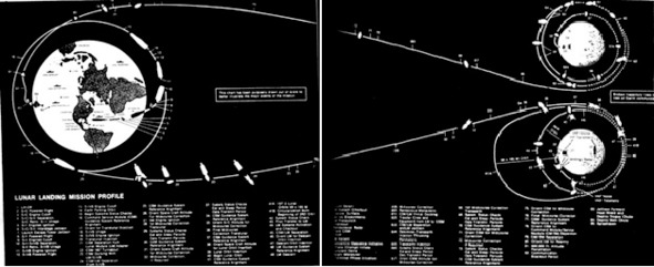 Следующие изображения демонстрируют схему полета на Луну, по версии НАСА. Билл Кейсинг продемонстрировал 15 этапов полета, невозможность 100 % успеха цепочки событий, согласно теории вероятности — примечание переводчика)