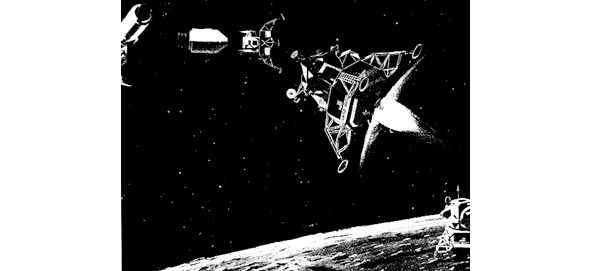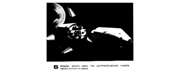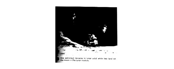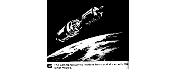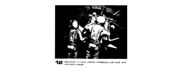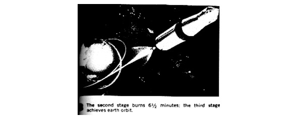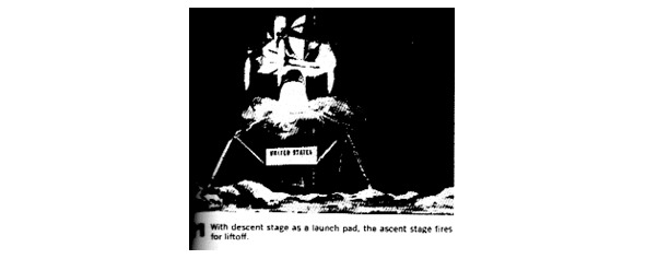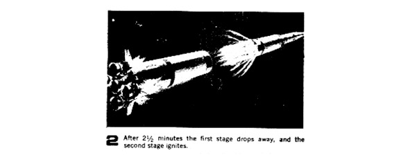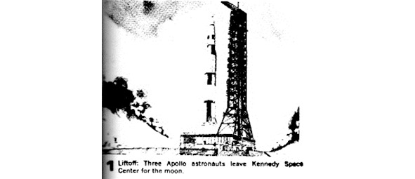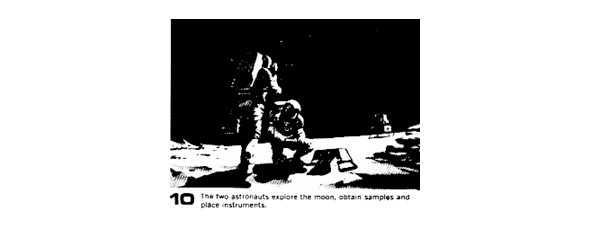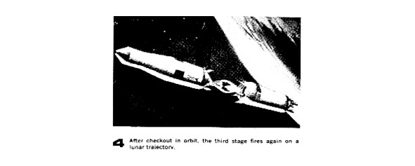 (Билл Кейсинг в одном из изданий своей книги использовал в этой части таблицу. В одном столбце, справа размещались изображения фотографий НАСА или художников НАСА. В другом столбце, слева были напечатаны комментарии автора. Такое расположение текста было неудобным для его восприятия и понимания. В этой публикации используется другое размещение изображений и комментариев автора к этим картинкам, более удобным для чтения. Сначала размещается изображение, внизу под ним размещается комментарии автора. Первое издание 1974 года было построена аналогичным образом.