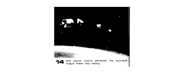 14. Блок сервисного модуля выбросили за борт, командный модуль входит в атмосферу, с высокой температурой на поверхности. И еще больше хлама… просто подумайте, сколько из них, этих обломков находится вокруг Земли в пространстве после семи «миссий» Аполлон.