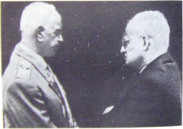 Маршал К. К. Рокоссовский вспоминает о минувших здесь боях. Справа Е. Воробьев. Яхрома, 1966 г.