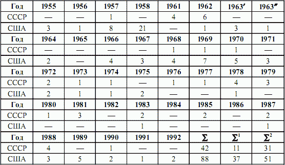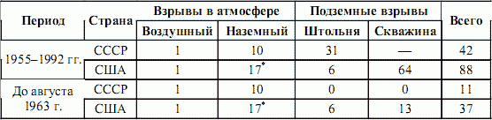 Примечания. 1. В таблице год 1963 разбит на две части – до вступления в силу Договора о запрещении ядерных испытаний в трех средах и после вступления.