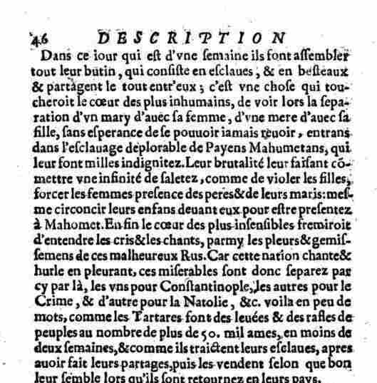 К рассматриваемой теме имеет отношение глава «Des Tartares du Crime». Боплан описывает, как тartares, действуя в два крыла, состоящие каждое из 8–10 тысяч всадников, несколько раз охватывают территорию набега на русские земли. Каждое селение они окружают с четырех сторон, а потом грабят, режут сопротивляющихся и уводят не только мужчин, но и женщин с младенцами. Разорив и опустошив охваченную территорию, татары отступают в степь и делят добычу. Как это происходит лучше читать его подлинное описание. Привожу фрагмент (стр. 46) главы «Des Tartares du Crime» cтр. 46.