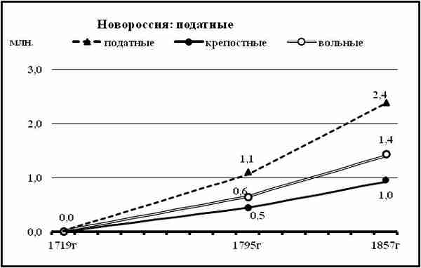 Графики показывают, как изменялась численность конкретных групп податных людей Новороссии в процессе действия крепостного права.
