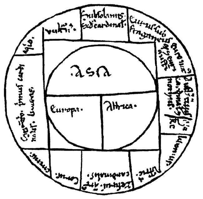 Скандинавские карты XIII–XVII веков, приложенные к географическим трактатам, еще весьма далеки от современных. Более того, довольно часто они вообще не являются картами в сегодняшнем понимании. Даже чисто внешне они сильно отличаются от привычных нам географических карт. Обычно изображение на них нанесено в виде круга, разделенного отрезками прямых на несколько частей, внутри каждой из которых перечислены страны, входящие в данную часть мира. То есть они являются скорее не картами, а списками географических названий, распределенных по частям света — Азии, Европе, Африке и т. п. (рис. 7).