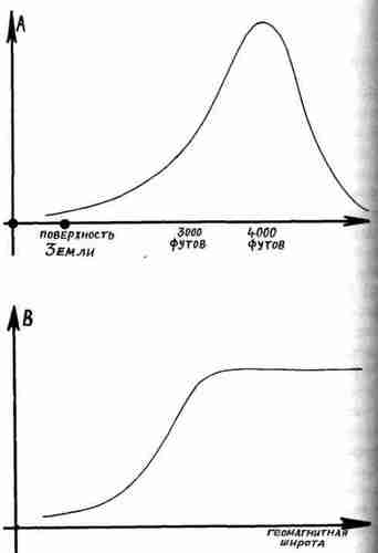 На рис. 56 в виде кривой В приведена зависимость потока нейтронов на высоте 30 тысяч футов от геомагнитной широты [986], с. 139. Измерения проводились до 1955 года. Выявляющаяся на рис. 56 (кривая В) зависимость плотности потока нейтронов (незаряженных частиц) от геомагнитной широты вставляет думать, что первичные частицы космического излучения, породившие нейтроны, являются частицами заряженными, отклоняемыми магнитным полем Земли. Существенно, что плотность потока нейтронов на широте 50 градусов — широта Парижа, Праги, Киева, Харькова — В ТРИ РАЗА БОЛЬШЕ плотности этого потока на широте 20–30 градусов — берег Красного моря, северный берег Африки.
