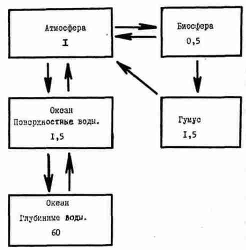 Числа на этом рисунке обозначают количество углерода в той или иной части обменного резервуара. Содержание углерода в атмосфере принято при этом за 1. Выход углерода из обменного резервуара в результате отложения осадков на дно океана на рис. 57 не отражен. «Под радиоуглеродным возрастом подразумевается время, прошедшее с момента выхода объекта из обменного фонда до момента измерения С14 в образце» [110], с. 32.