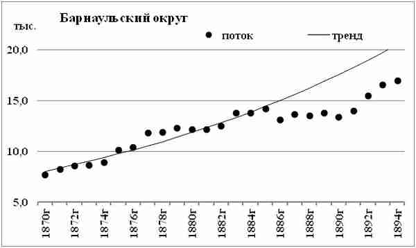 Поток растущих детей Барнаульского округа подобен потоку губерний Черноземного Центра. До 1885 года поток более–менее равномерный, прирост существенно больше — около 4%. Затем спад, который длился до начала 1890?х. Глубина провала в потоке растущих детей — около 20%. Такого провала в округах других губерний Сибири нет.