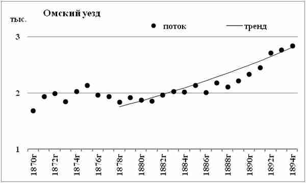 Отличие от Барнаульского округа в Омском уезде поток растущих детей до второй половины 1870?х имеет сильную неравномерность. Это следствие двух факторов:
