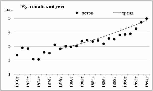 — переезд в Кустанайский уезд переселенцев из центральных губерний России, среди которых было неравномерное распределение людей 20–25-летнего возраста;