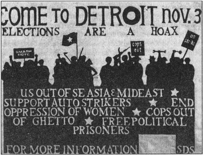 Плакат Эс-ди-эс, приглашающий на демонстрацию перед днем выборов (1968). (Центр изучения политической графики) «3 ноября — все в Детройт! Выборы — это обман! Долой полицию! К забастовке! Прочь из Юго-Восточной Азии и с Ближнего Востока! Поддерживаем забастовку шоферов! Прекратите дискриминацию в отношении женщин! Полиция, вон из гетто! Свободу политическим заключенным! За дальнейшей информацией обращайтесь в Эс-ди-эс»