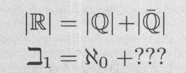 Но даже просто знание того, что бет-один больше, чем алеф-ноль, позволяет увидеть некоторые замечательные вещи. Например, мы знаем, что рациональные числа исчислимы и имеют кардинальность алеф-ноль. Но вещественные числа представляют собой объединение набора рациональных чисел и набора — иррациональных чисел, и мы знаем, что вещественные числа имеют кардинальность бет-один.