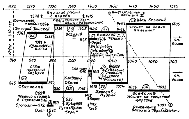Рис. 4. Наглядное изображение сдвига на 410 лет в русской истории. Эпоха 940-1100 годов н. э. В значительной степени является фантомным отражением более поздней эпохи 1350–1510 годов н. э.