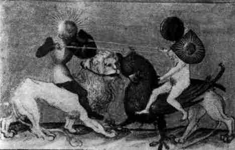 Рис. 90. Борьба Солнца и Луны. Однако на щите Солнца мы видим полумесяцы — символы Луны, а на щите Луны — изображение Солнца. Миниатюра якобы конца XIV века. Таким образом, в средневековой астрономии символы Луны и Солнца могли иногда путаться. Взято из [643:2], илл. 2.