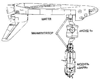 6 декабря 1998 года американский корабль многоразового использования Шаттл доставил на орбиту блок «Ноуд- 1» и состыковал его с модулем «Заря» при помощи бортового манипулятора. Собранная конструкция осталась на орбите на несколько месяцев.