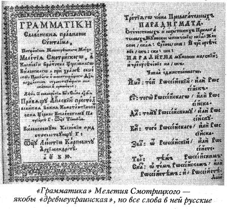 Так какой же язык описывает книга Смотрицкого и на каком языке она написана? Открываем подлинник и читаем на титульной, странице: «Грамматики славенския правилное синтагма, потщанием многогрешного мниха Мелетия Смотрицкого». Очень по-украински звучит? А знаете, какими терминами оперировал Смотрицкий в своем учебнике? Время у него «будущее» и «настоящее», а не «майбутнє» и «теперішнє», число, естественно, «множественное» и «единственное». Он употребляет термин «глагол — есть часть слова скланяемая», а не «дієслово», как в современных украинских учебниках. Падежи у него — «именительный», «родительный», «дательный», «винительный», «звательный», «творительный». Особенно же забавно читать страницу, где он склоняет страшное для любого националиста слово «российский»! И хоть бы раз на всю «Грамматику» Смотрицкий употребил существительное «Украина» или прилагательное «украинский»! «Грамматика» Смотрицкого описывает правила РУССКОГО ЯЗЫКА, на котором и говорил этот образованный монах из Подолии.