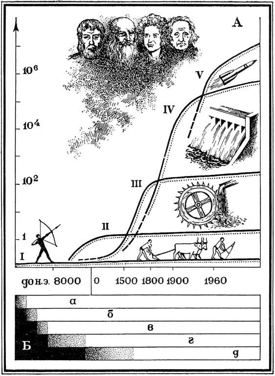 Б – духовное развитие: а – трудовые навыки, б – религия, в – искусство, г – философия, д – наука. Масштаб по вертикали и горизонтали – логарифмический (ступени в реальности круче, чем на графике)