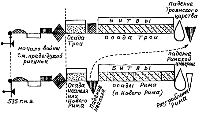 Рис. 27б. Продолжение параллелизма между Троянской и Готской войнами. Эта схема наглядно изображает наложение основных событий при осаде Трои и осаде Нового Города и Рима.