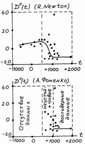 Рис. 67. Сравнение графиков D?, вычисленных Р. Ньютоном и А.Т. Фоменко. Новый график D? никаких разрывов, скачков не имеет и колеблется около постоянного значения. Параметр D? измеряется здесь в «/столетие2», то есть в секундах/столетие2.