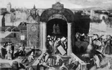 Рис. 1.62a. «Изгнание торгующих из храма». Питер Брейгель Старший. Обратите внимание, что на куполе иерусалимского храма высится османский = атаманский полумесяц. Взято из [1053:1], илл. 14.