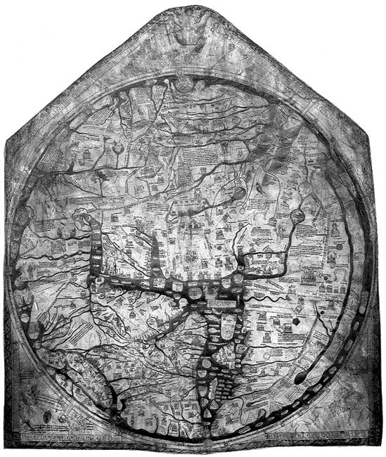 Рис. 145. Знаменитая средневековая Херефорд-карта (Hereford), изготовленная якобы в конце XIII века. Ее диаметр около 1,3 метра. В ее левом нижнем углу изображен «древний» римский император Август на троне. На его голове корона с христианским крестом. Увеличенное изображение см. на следующем рисунке. Взято из [1177], с. 311.