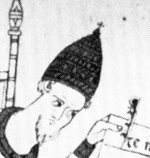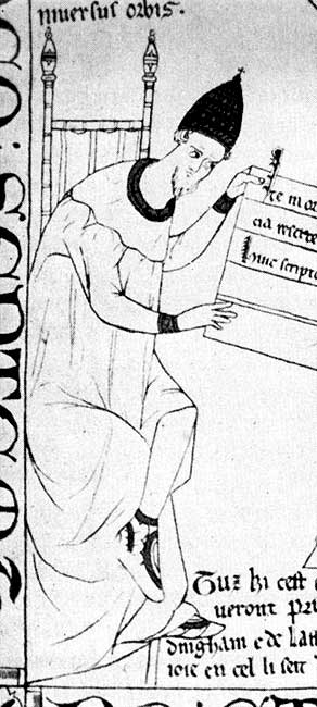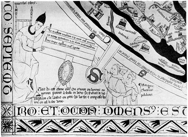 Рис. 146. Левый нижний угол Херефорд-карты. «Античный» римский император Август на троне. На его голове — корона, увенчанная ХРИСТИАНСКИМ КРЕСТОМ.