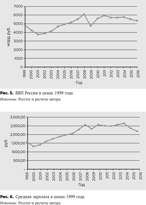 Российская экономика находится в процессе кризисного сокращения, архаизации и потери конкурентоспособности. Однако это не значит, что она близка к краху. На конец 2015 года показатели подушевого ВВП в России соответствуют в реальных ценах уровню 2006 года, уровень средней зарплаты — 2007 году. При ожидаемых показателях экономики за 2016 год эти показатели отступят на год — к уровням 2005 и 2006 годов соответственно. Эти годы не характеризовались существенными проблемами в экономике. В таком темпе у России есть куда отступать: на пике падения в 1999 году, когда казалось, что еще шаг — и экономика развалится, подушевой ВВП был на 21 %, а средняя зарплата на 40 % ниже уровней 2016 года (см. рис. 5 и 6).